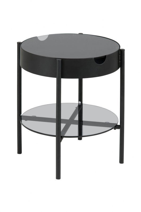 Sohvapöytä, jossa jauhemaalattu metallirunko ja 6 mm:n lasilevy. Säilytystila. Halkaisija 45, korkeus 50 cm. Toimitetaan osina.