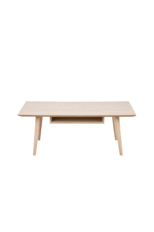 Sohvapöytä. Valkolakattua tammiviilua. 1 säilytyslokero pöydän alla. 115×60, korkeus 42 cm. Toimitetaan osina.