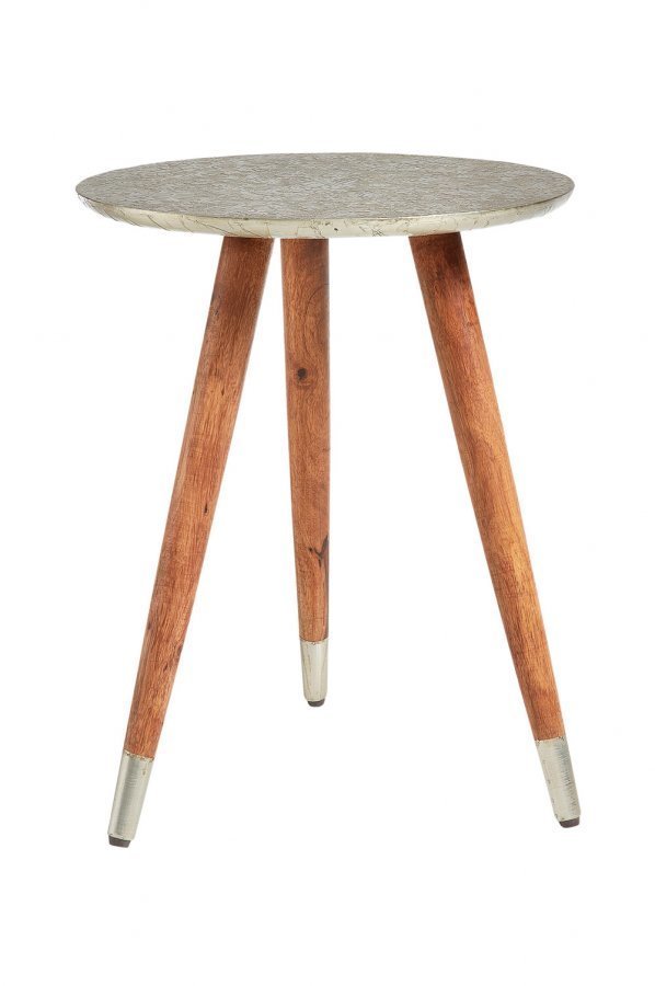 Sivupöytä, jossa puujalat ja hopeanvärinen pöytälevy. Korkeus: 50 cm Leveys: 40 cm Syvyys: 40 cm