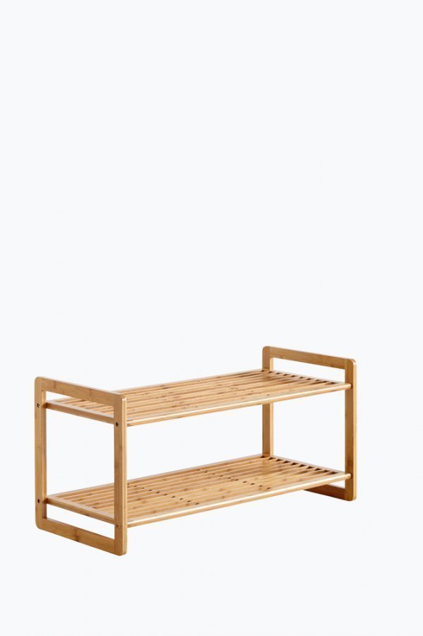 Kenkäteline, jossa kaksi hyllytasoa. Bambua. Koko 75×33 cm, korkeus 36 cm. Hyllyjen välinen etäisyys 21 cm. Telineiden väri vaihtelee bambun kasvupaikan ja iän mukaan. Toimitetaan osina.