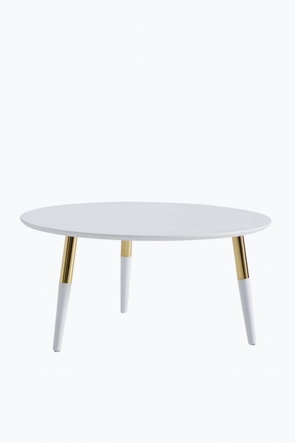Pyöreä sohvapöytä. Pöytälevy saarniviilutettua MDF-levyä. Pöytälevyssä viistot reunat. Jalat massiivikumipuuta, detaljit metallia. Korkeus 40 cm. ø 80 cm. Toimitetaan jalat irrallaan.