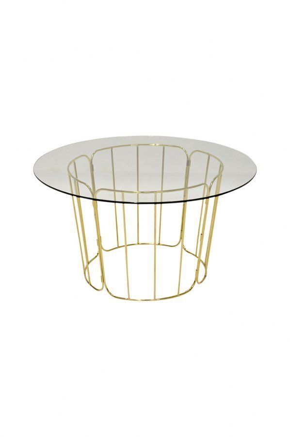 Pöytälevy kirkasta karkaistua lasia, paksuus 8 mm. Pyöreä jalusta kiiltävää messinkiä. Halkaisija 85 cm, korkeus 47 cm. Helppo koota.