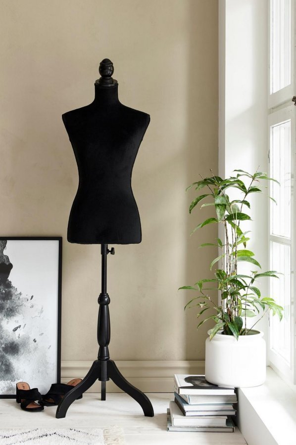Sovitusnukke MDF-levyä ja puuta. Päällystetty puuvillaplyysillä. Säädettävä kokonaiskorkeus 133 165 cm. Torson korkeus 65 cm. Rinnanympärys 87, vyötärö 65, lantio 90 cm Jalan ø n. 40 cm. Toimitetaan osina.
