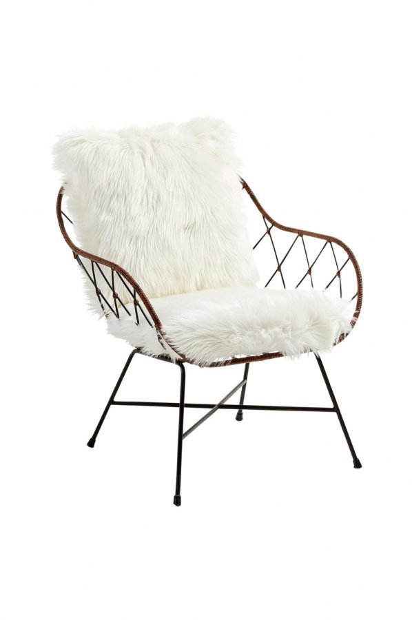 Nojatuoli mustaa metallia, detaljit rottinkia. Mukana tekoturkistyynyt. Korkeus: 77 cm Leveys: 63 cm Syvyys: 68 cm