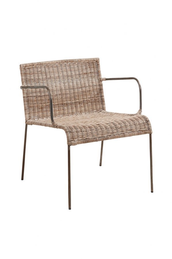 Nojatuoli rottinkia ja maalattua metallia. Korkeus 68 cm, leveys 57,5 cm, syvyys 59 cm. Istuinsyvyys 50 cm. Toimitetaan koottuna.