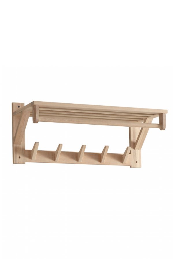 Hattuhylly valkopestyä tammea. 5 ripustuskoukkua. Leveys 70 cm, korkeus 30 cm, syvyys 30 cm. Toimitetaan koottuna.