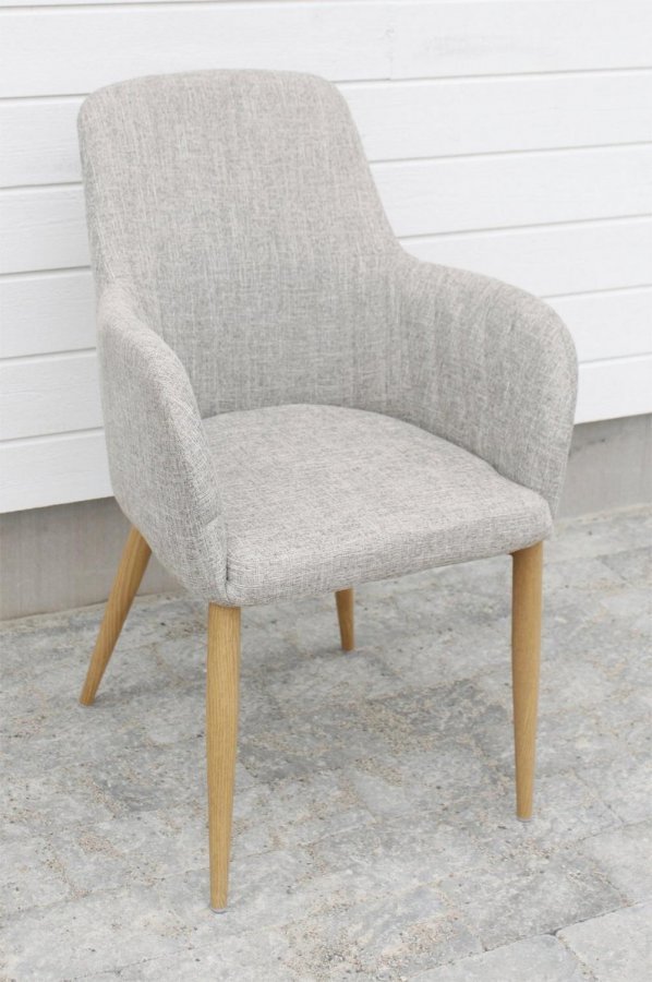 Moderni ja miellyttävä ruokapöydän tuoli. Vakaa tuoli, jossa tammimaiset metallijalat. Korkeus: 90 cm, syvyys: 63 cm, istuinkorkeus: 45 cm, istuinsyvyys: 46 cm, leveys: 56 cm.