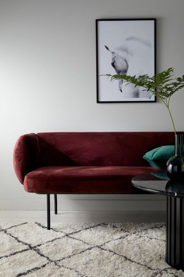Sohva, jossa jauhemaalatut metallijalat ja puurunko. Päällinen samettia ja täyte vaahtomuovia. Korkeus 70 cm, leveys 185 cm, syvyys 75 cm. Istuinkorkeus 44 cm, istuinsyvyys 53 cm. Jalat kiinnitetään toimituksen jälkeen.