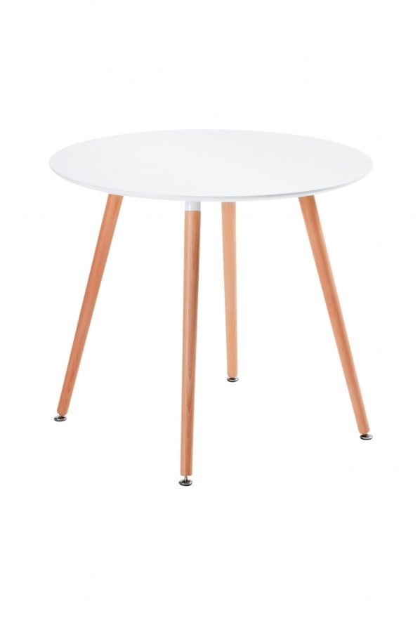 Pöytä, jossa maalattu pöytälevy ja jalat pyökkiä. Korkeus 73 cm, Leveys 100 cm, Syvyys 100 cm.