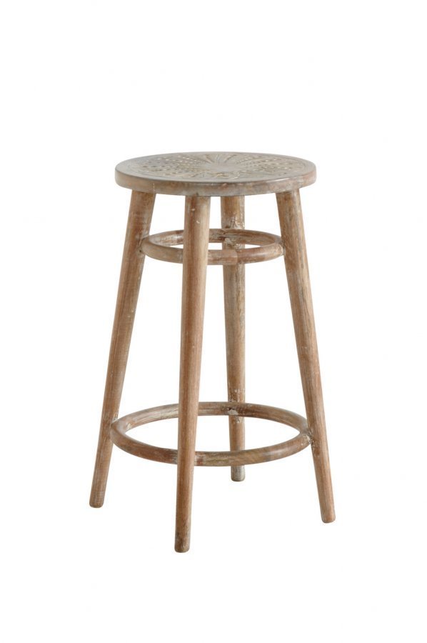 Baarijakkara mangopuuta, jossa patinoitu viimeistely. Istuinosassa kaiverrettu kuvio. Korkeus 62 cm. Istuinosan ø 35 cm. Jalkaosan ø 45 cm. Toimitetaan koottuna.