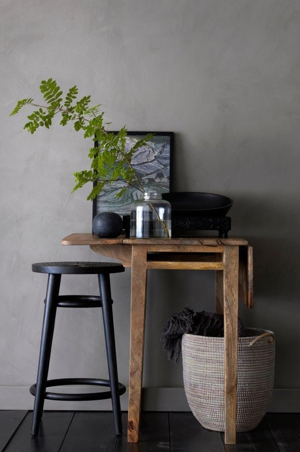 Baarijakkara mangopuuta, jossa patinoitu viimeistely. Istuinosassa kaiverrettu kuvio. Korkeus 62 cm. Istuinosan ø 35 cm. Jalkaosan ø 45 cm. Toimitetaan koottuna.