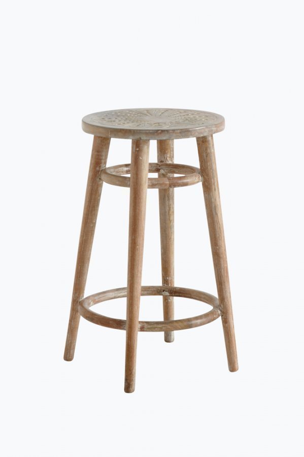 Baarijakkara mangopuuta, jossa patinoitu viimeistely. Istuinosassa kaiverrettu kuvio. Korkeus 62 cm. Istuinosan ø 35 cm. Jalkaosan ø 45 cm. Toimitetaan koottuna.