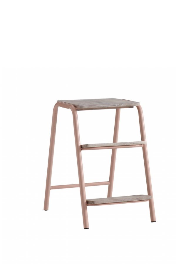 Porrasjakkara puuta ja metallia. Korkeus 58 cm. Istuinosan mitat 38×30 cm. Alaosan mitat 57×38 cm. Toimitetaan koottuna.