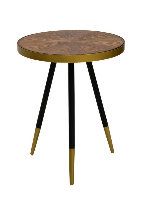 Pähkinäpuinen pikkupöytä, jossa messinginväriset yksityiskohdat. Halkaisija 44 cm, korkeus 55 cm. Asenna jalat itse.