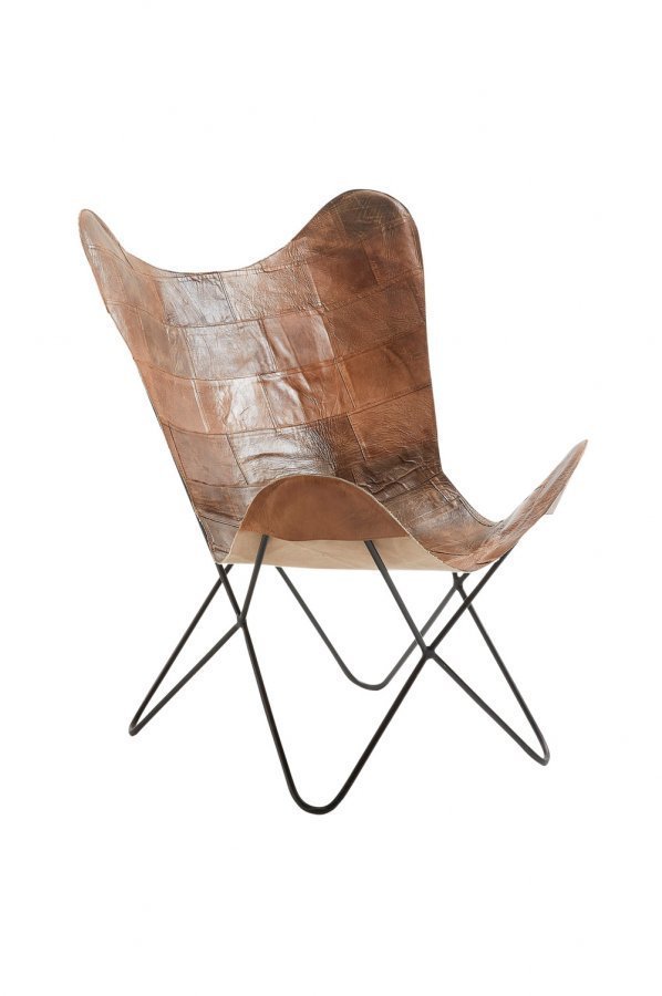 Nojatuoli, jossa metallirunko ja tilkkukuvioinen nahkaistuin. Korkeus 87 cm, Leveys 75 cm, Syvyys 86 cm.