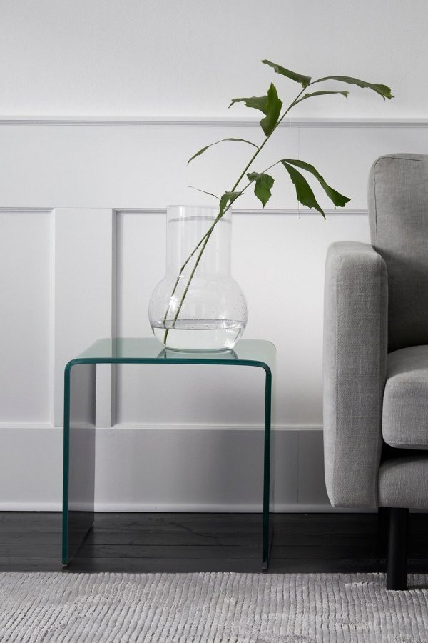 Sivupöytä karkaistua lasia. Koko 42×42 cm. Korkeus 42 cm. Lasin paksuus 12 mm.