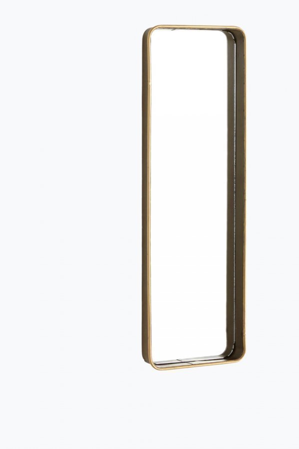 Koristeellinen peili, jota voi käyttää myös tarjottimena. Kehys messinginväristä metallia. Ripustetaan pystyasennossa. Mitat n. 26×81 cm. Syvyys n. 5 cm.