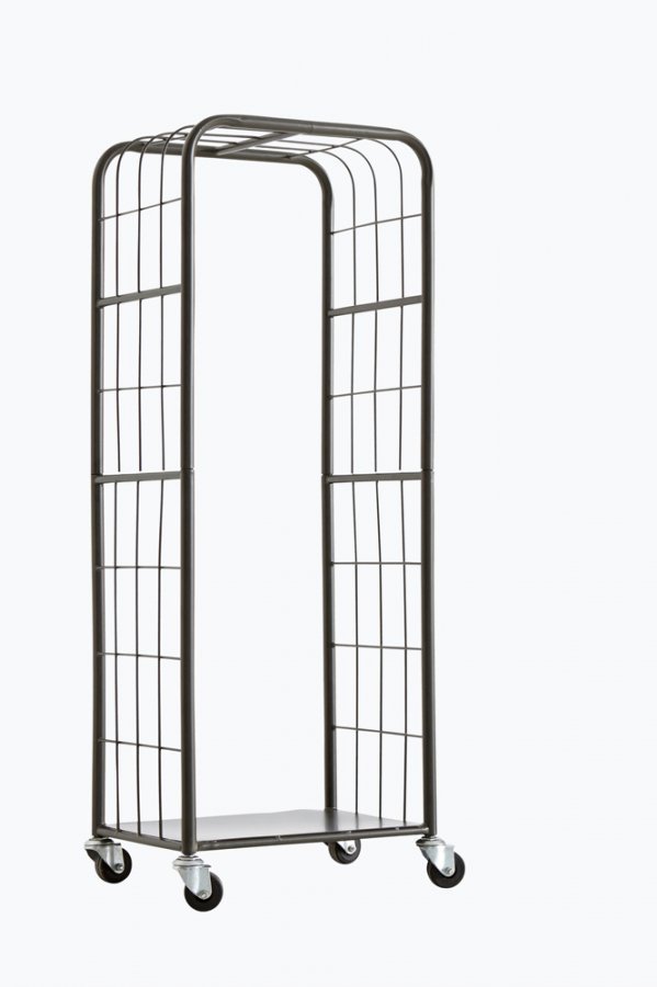 Metallinen halkojen säilytysvaunu, jossa isot pyörät. Mitat 30×40 cm. Korkeus 106 cm. Toimitetaan osina.