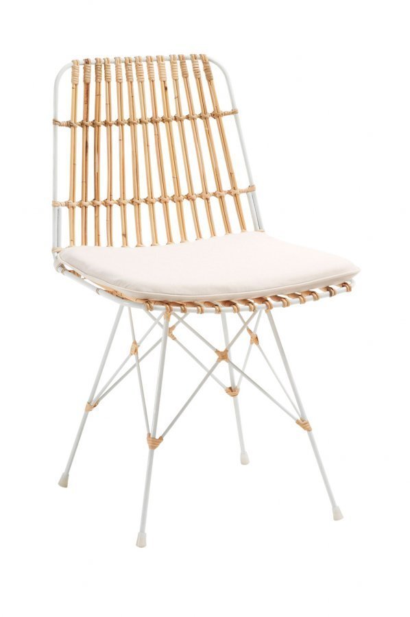Rottinkituoli, jossa valkoiseksi maalattu runko. Irrotettava tyyny luonnonväristä puuvillaa. 2/pakk. Korkeus: 80 cm Leveys: 47 cm Syvyys: 54 cm
