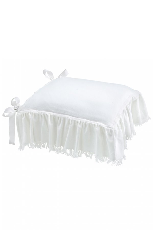 Röyhelöreuna neljällä sivulla. Raakareunat. Solmimisnauhat ja piilovetoketju takana. Pestyä puuvillapanamaa. Pesu 40º. Koko 42×42 cm. Röyhelön korkeus n. 13 cm. 100% puuvillaa Pesu 40°