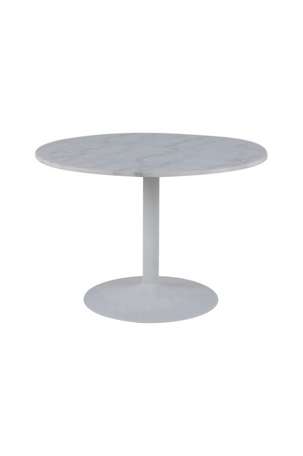 Ruokailutilan pöytä, jossa valkoiseksi maalattu trumpettijalka metallia. Marmorilevy. Halkaisija 110 cm, korkeus 75 cm. Toimitetaan osina.
