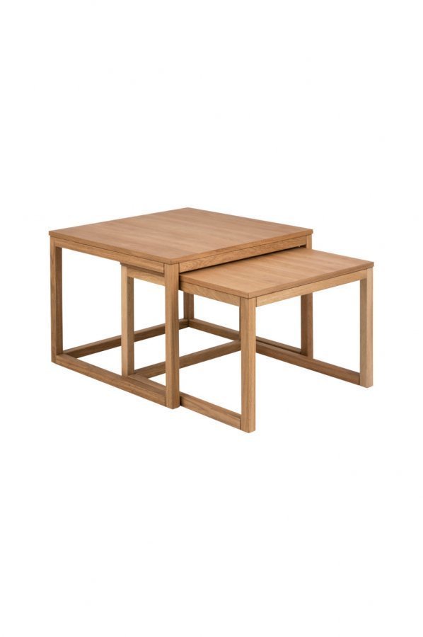 Kaksiosainen sarjapöytä tammiviilua. 70 x 70 cm, korkeus 50 cm; 67 x 61,5 cm, korkeus 44 cm. Toimitetaan osina.