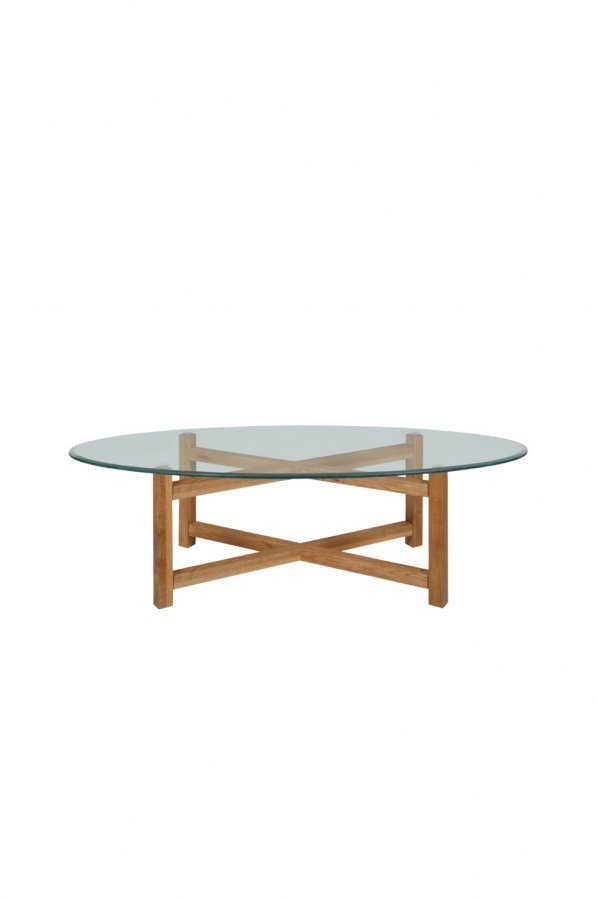 Sohvapöytä öljyttyä massiivitammea, 12 mm:n lasilevy. 140×65, korkeus 45 cm. Toimitetaan osina.