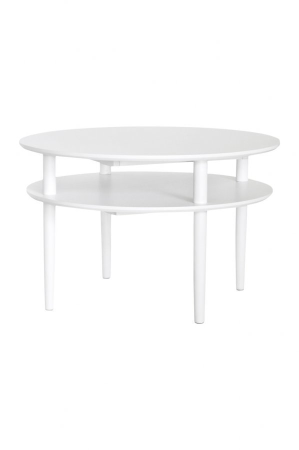 Sohvapöydän mitat: halkaisija 80 cm, korkeus 50 cm. Öljyttyä massiivitammea, mustaksi petsattua puuta tai valkoiseksi maalattua MDF-levyä. Toimitetaan osina.