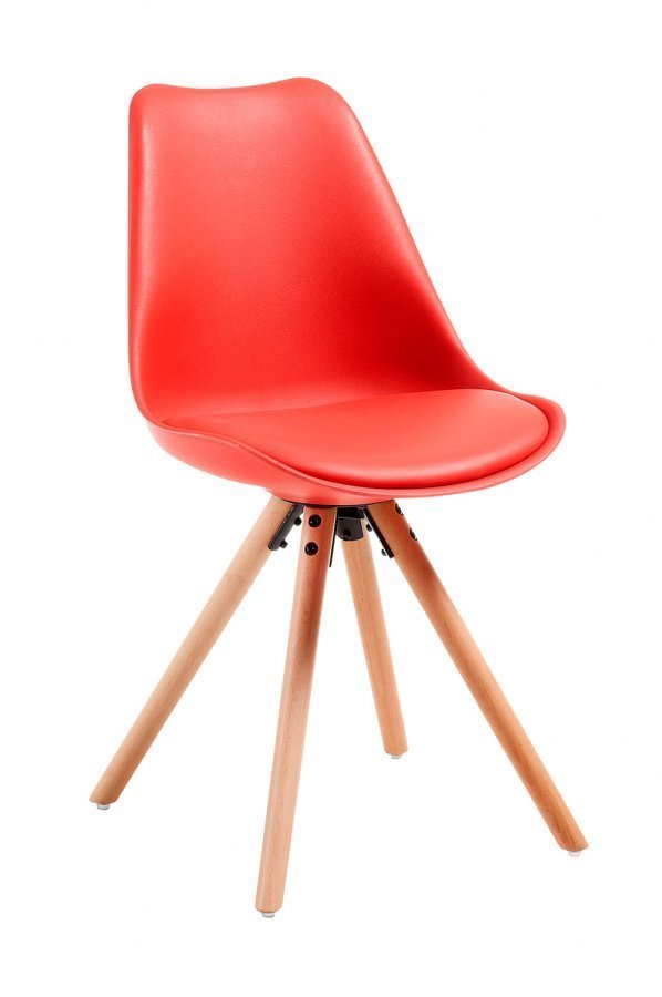 Punainen polypropeenituoli, jossa kolme jalkaa luonnonväristä pyökkiä. 4/pakk. Korkeus: 81,5 cm Leveys: 48 cm Syvyys: 56 cm