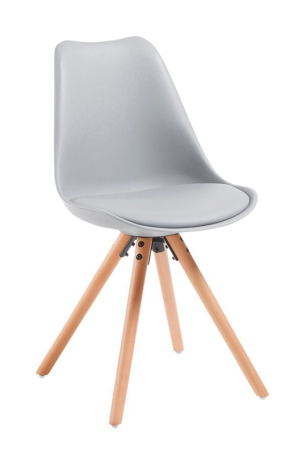 Harmaa polypropeenituoli, jossa kolme jalkaa lakattua luonnonväristä pyökkiä. 4/pakk. Korkeus: 81,5 cm Leveys: 48 cm Syvyys: 56 cm
