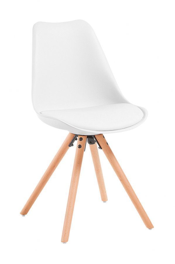 Valkoinen polypropeenituoli, jossa kolme jalkaa lakattua luonnonväristä pyökkiä. 4/pakk. Korkeus: 81,5 cm Leveys: 48 cm Syvyys: 56 cm