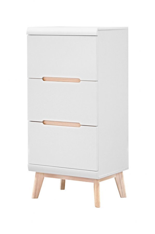 Vahattu MDF-lipasto valkoista melamiinia, puuyksityiskohdat saarnea. 3 soft close -vetolaatikkoa. Leveys 54 cm, syvyys 42 cm, korkeus 115 cm. Toimitetaan osina. Paino 38 kg. Tarkista rahtimaksu Toimitus-välilehdeltä.