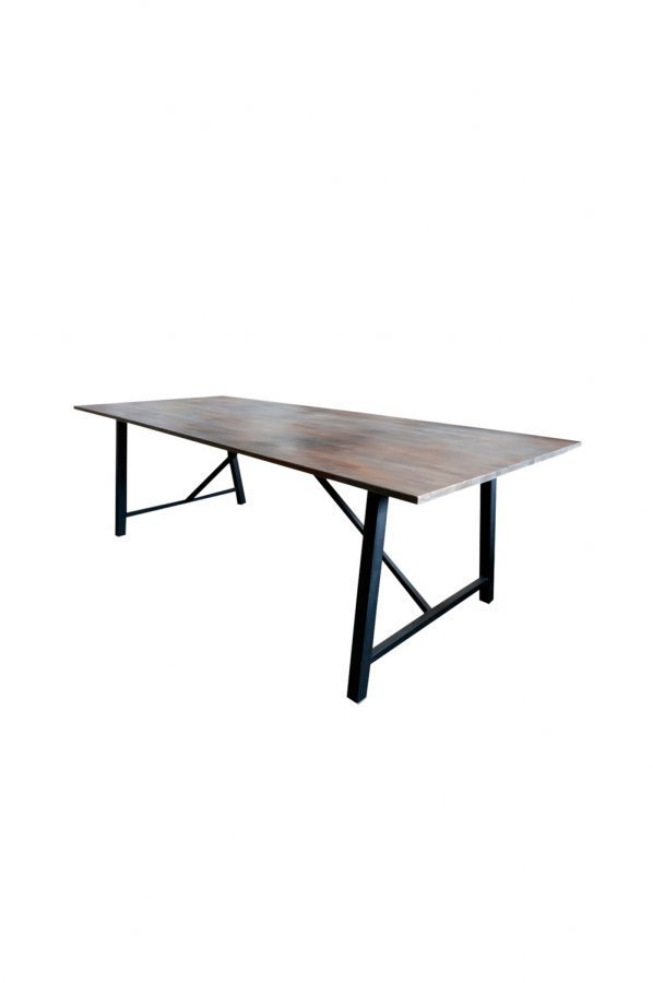 Mas-ruokapöytä on kookas ja vakaa. Jalusta mustaa metallia ja massiivinen pöytälevy harmaapetsattua tiikkiä. Korkeus: 76 cm. Leveys: 100 cm. Pituus 250 cm. Jalkojen välinen etäisyys 180 cm. Toimitetaan osina.