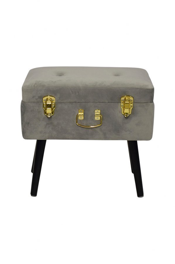 Samettijakkara, jossa säilytystila. Leveys 50, syvyys 35, korkeus 46 cm. Messinginväriset, koristeelliset yksityiskohdat. Toimitetaan jalat irrallaan.