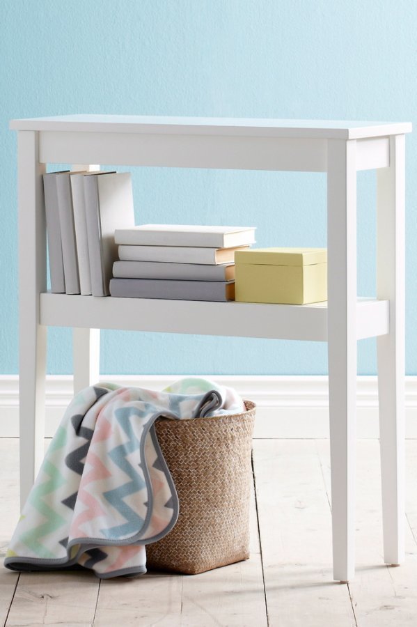 Ruiskumaalattua mäntyä ja MDF-levyä. Kaksi hyllytasoa. Korkeus 80 cm, leveys 70 cm, syvyys 25 cm. Toimitetaan osina.