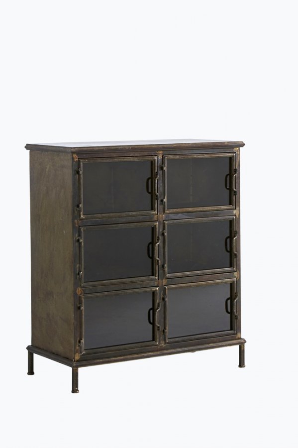 Teollishenkinen kaappi peltiä. 6 lokeroa, joissa vasemmalle avautuvat luukut. Luukkujen etuosa lasia. Mitat: 86×42 cm. Korkeus 100 cm. Toimitetaan koottuna. Rahtipaino 90 kg. Tarkista rahtimaksu Toimitus-välilehdeltä.
