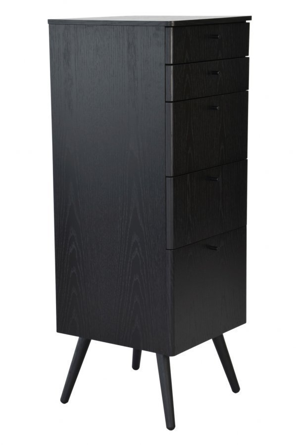 Lipasto MDF-levyä ja vaneria. Mitat: Leveys 40 cm, syvyys 40 cm, korkeus 106 cm. 5 vetolaatikkoa. Jalkojen korkeus 21 cm. Toimitetaan koottuna. Paino 29 kg. Tarkista rahtimaksu Toimitus-välilehdeltä.