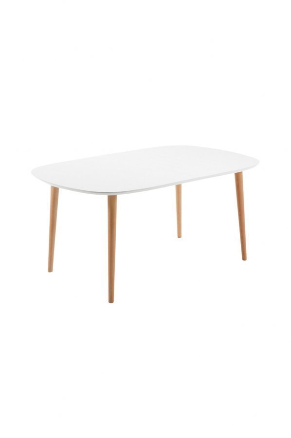 Soikea jatkettava pöytä, jonka pöytälevy valkoiseksi maalattua mattapintaista kuitulevyä. Jalat luonnonväristä pyökkiä. Enimmäispituus 260 cm. Korkeus: 74 cm Leveys: 160/260 cm Syvyys: 100 cm