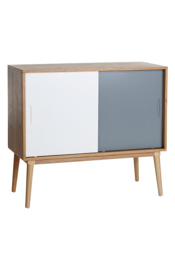 Puuta, liukuovet ruiskumaalattua MDF-levyä. Runko MDF-levyä ja tammiviilua, jalat massiivitammea. Väliseinä sisällä. P 90 cm. S 40 cm. K 80 cm. Toimitetaan osina.