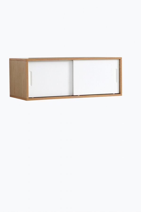 Kaappi puuta, liukuovet ruiskumaalattua MDF-levyä. Runko MDF-levyä ja tammiviilua, jalat massiivitammea. Sisällä väliseinä. Korkeus 30 cm. Leveys 80 cm. Syvyys 36 cm. Toimitetaan osina.