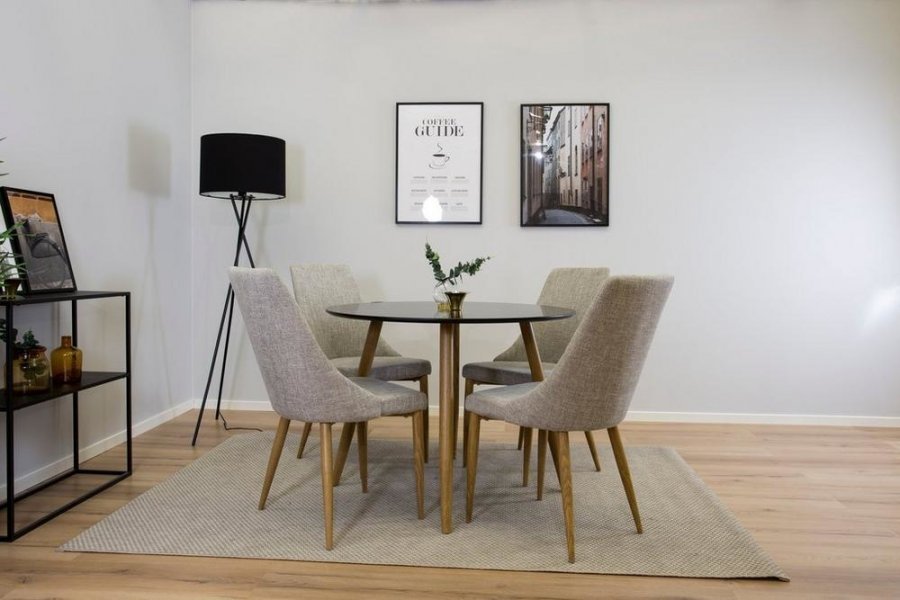Mukava ruokapöytä, jossa musta pöytälevy ja tammea muistuttavat metallijalat. Halkaisija: 100 cm, korkeus: 75 cm