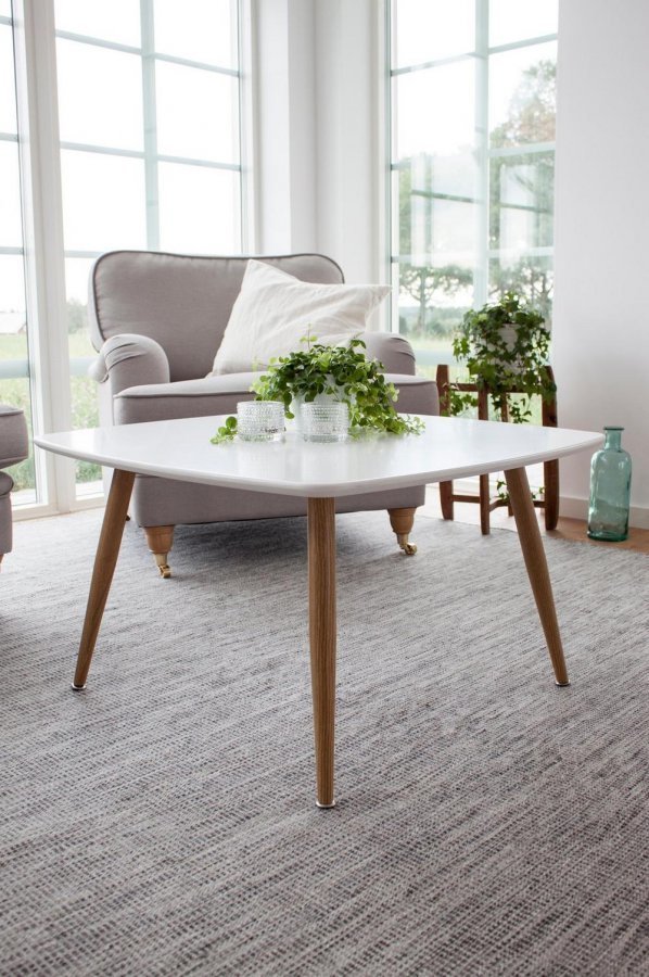 Moderni sohvapöytä, jossa valkoinen MDF-pöytälevy ja tammea muistuttavat metallijalat. Leveys: 80 cm, pituus: 80 cm, korkeus: 46 cm.