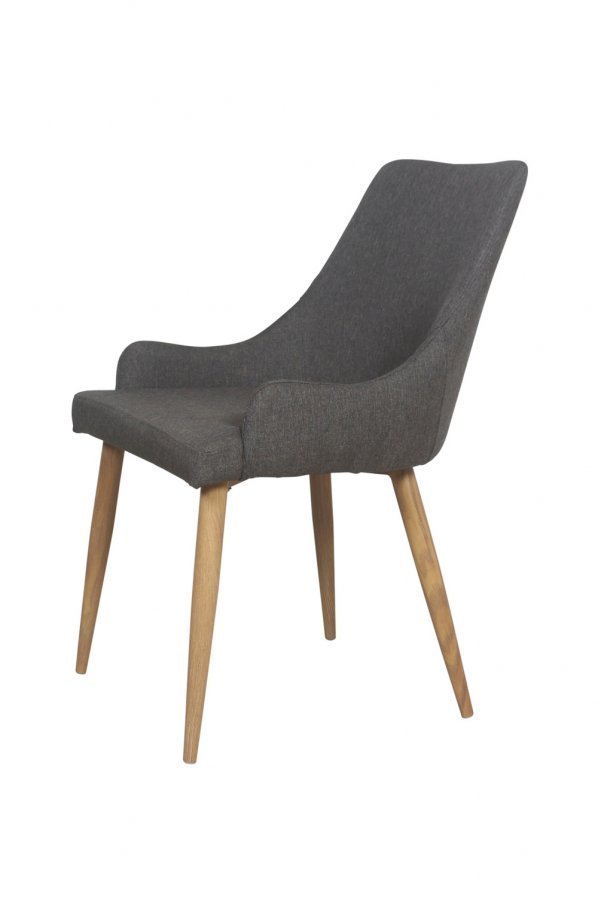 Moderni ja miellyttävä ruokapöydän tuoli. Vakaa tuoli, jossa tammimaiset metallijalat. Korkeus: 86 cm, syvyys: 60 cm, istuinkorkeus: 47 cm, istuinsyvyys: 45,5 cm, leveys: 50 cm.