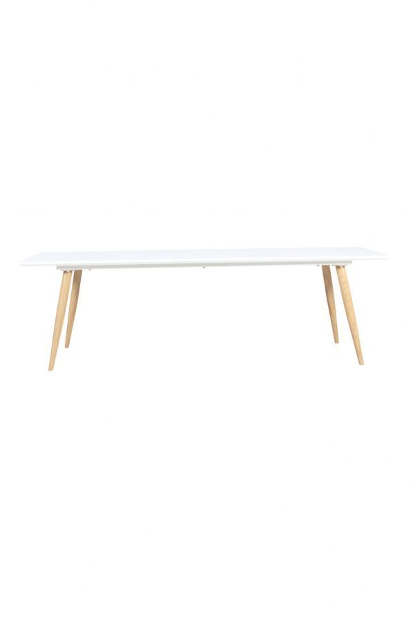 Moderni TV-taso sopii käytettäväksi myös penkkinä. Valkoinen MDF-pöytälevy ja tammea muistuttavat metallijalat. Leveys: 43 cm, pituus 150 cm, korkeus 50 cm.