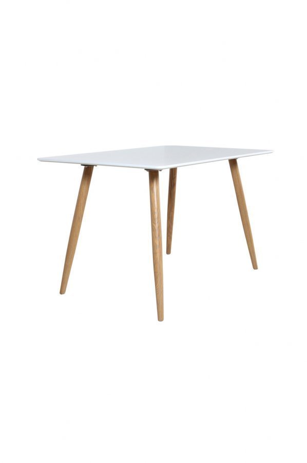 Moderni ruokapöytä, jossa valkoinen pöytälevy ja tammea muistuttavat metallijalat. Vakaa ja käytännöllinen pöytä. Leveys: 80 cm, pituus: 120 cm, korkeus: 75 cm
