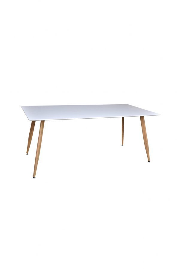 Moderni ruokapöytä, jossa valkoinen pöytälevy ja tammea muistuttavat metallijalat. Vakaa ja käytännöllinen pöytä. Leveys: 90 cm, pituus: 180 cm, korkeus: 75 cm