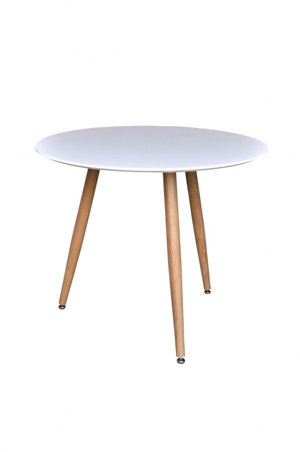 Moderni ruokapöytä, jossa valkoinen pöytälevy ja tammea muistuttavat metallijalat. Vakaa ja käytännöllinen pöytä. Halkaisija: 90 cm, korkeus: 75 cm