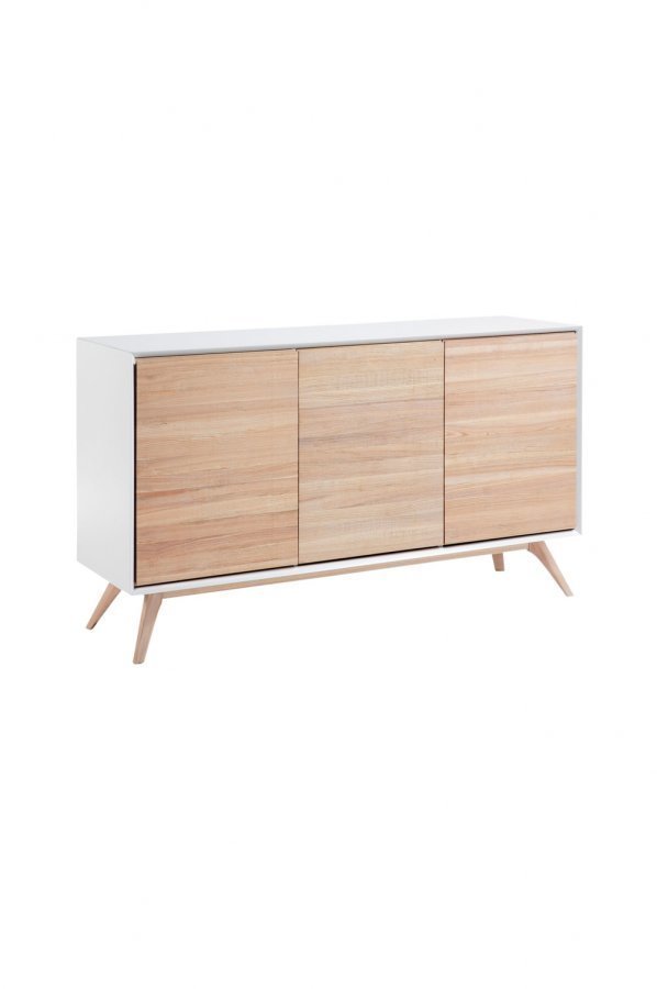 Sivupöytä, jossa ovet ja jalat saarnia. Runko valkoiseksi maalattua mattapintaista kuitulevyä. Korkeus: 88 cm Leveys: 154 cm Syvyys: 45 cm