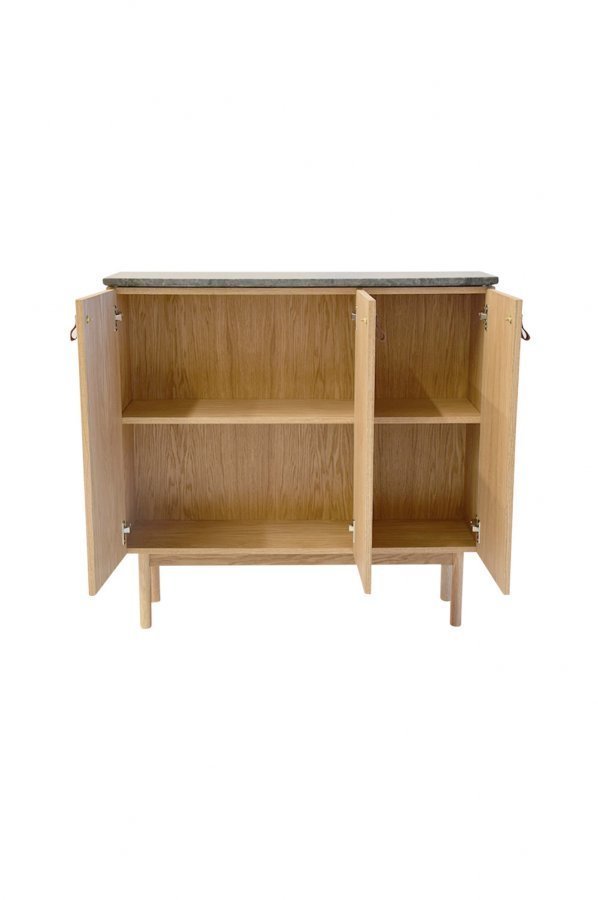 Ragnar-senkki viilutettua tammea. Nahkakahvat ja ylimpänä musta graniittilevy. Helppo sijoittaa kätevän kokonsa ansiosta. Koko 100×30 cm, korkeus 95 cm. Toimitetaan jalat ja päällyslevy irrallaan.