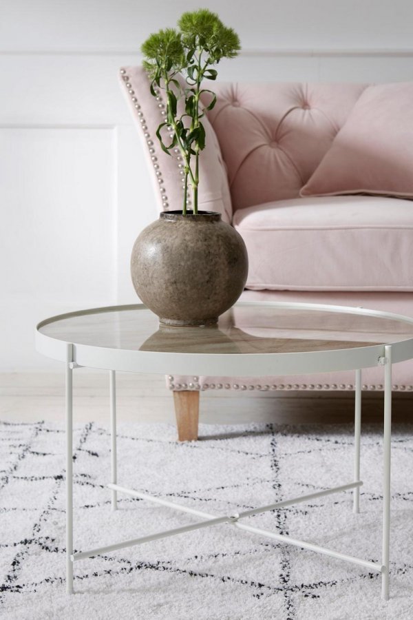 Sohvapöytä metallia. Laminoitu lasilevy, jossa marmori-look. Mitat: Ø 63 cm. Korkeus 40 cm. Toimitetaan osina.